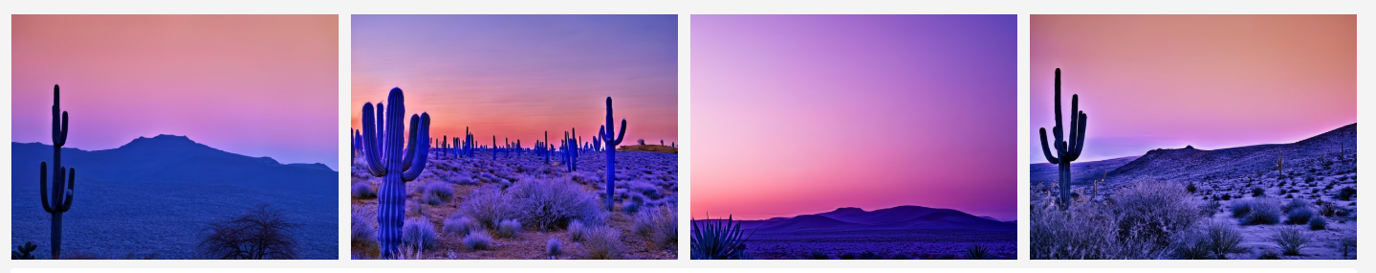 Prompt: Toma de paisaje que consiste en un fondo de cielo rojo rosado detrás de una escena desértica en violeta degradado con cactus azules altos con arbustos secos caprichoso, conceptual, minimalismo, grano