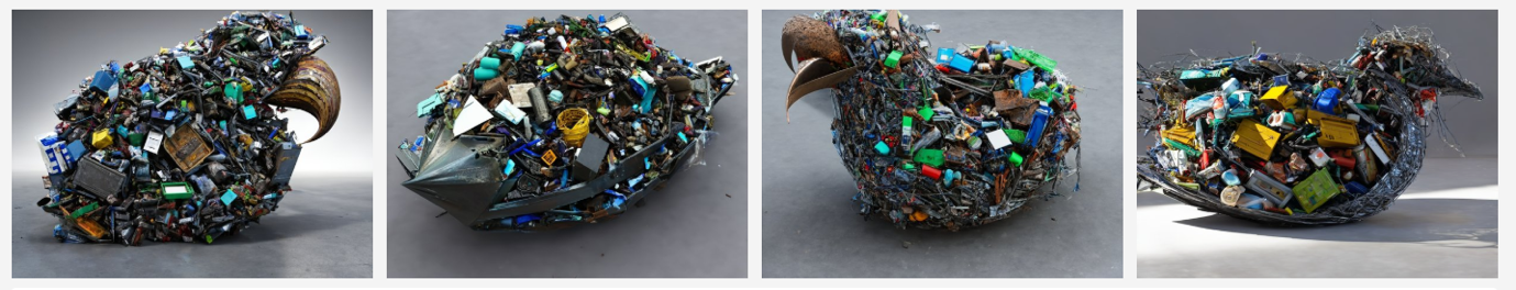 Prompt: Texturas macro de primer plano de acero destruido y aplastado, destrozado y retorciéndose en forma de un enorme pájaro sentado, compuesto de basura, escombros, desechos, plásticos, juguetes, animales de peluche, partes de computadoras, cables, productos electrónicos, barriles de petróleo y todo tipo de contaminación humana posible.