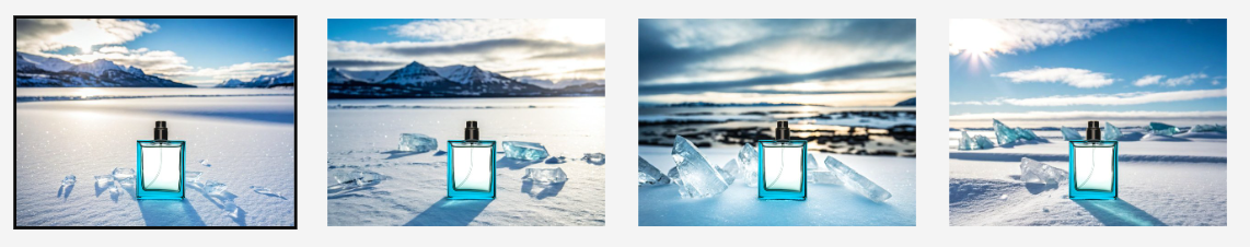 Prompt: Fragmentos de cristal azul helado se fusionan alrededor de la base de una botella de perfume en un hermoso e impresionante paisaje ártico.