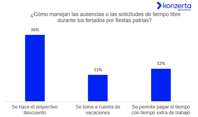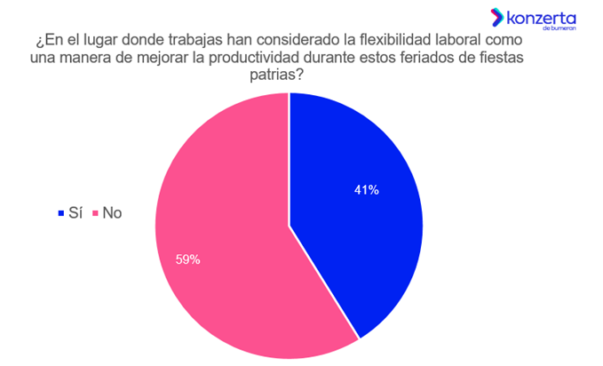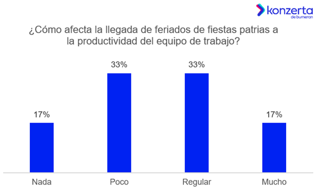 “El 73% de los talentos cree que los feriados por fiestas patrias no afectan a su productividad, y el 41% menciona que en sus organizaciones se adoptarán alternativas de trabajo flexible. Aunque las festividades ofrecen un descanso valioso, los múltiples días feriados pueden fragmentar la jornada laboral y afectar la productividad si no se planifican adecuadamente.”, explicó Jeff Alejandro Morales, Gerente de Marketing de Konzerta.