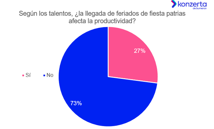 Por otro lado, el estudio analiza la productividad y motivación desde la perspectiva de las personas trabajadoras. El 73% de los talentos asegura que los feriados no afectan su productividad frente al 27% que indica que si lo hacen.
