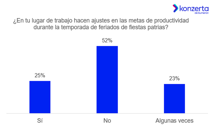 Además, el 52% de las personas trabajadoras indica que en las empresas donde trabajan no se realizan ajustes en las metas de productividad durante los feriados, mientras que el 25% afirma que si lo hacen y el 23% dice que lo implementan sólo en algunas ocasiones.