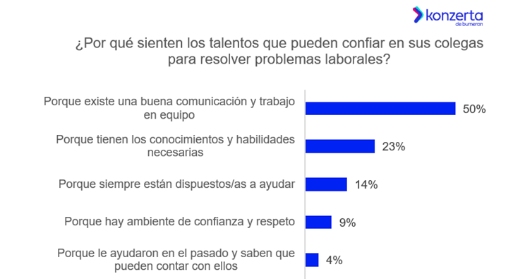 Entre las principales razones por las que confían en sus colegas el 50% menciona que lo hace porque existe buena comunicación y trabajo en equipo; el 23% porque sus colegas tienen los conocimientos y habilidades necesarias; el 14% porque sus compañeros siempre están dispuestos a ayudar; el 9% porque hay ambiente de confianza y respeto y el 4% porque se han ayudado en el pasado.