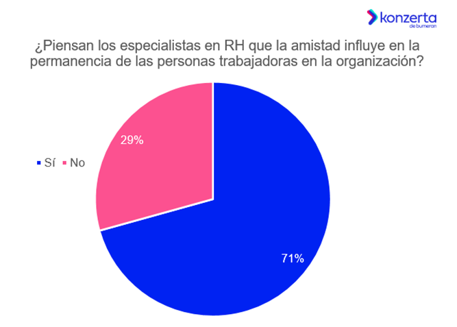 Además, el 71% de los especialistas piensa que la amistad influye en la permanencia de los talentos en la organización, frente al 29% que cree que no influye.