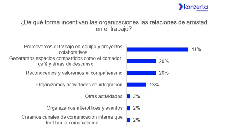 Entre las acciones o actividades que realizan para incentivar las relaciones de amistad el 41% de los especialistas dice que promueven el trabajo en equipo y proyectos colaborativos; el 20% generan espacios compartidos como el comedor, café y áreas de descanso; el 20% reconocen y valoran el compañerismo; el 13% organizan actividades de integración; el 2% organizan after offices y eventos; otro 2% crean canales de comunicación interna que facilitan la comunicación el 2% menciona otro tipo de actividades.