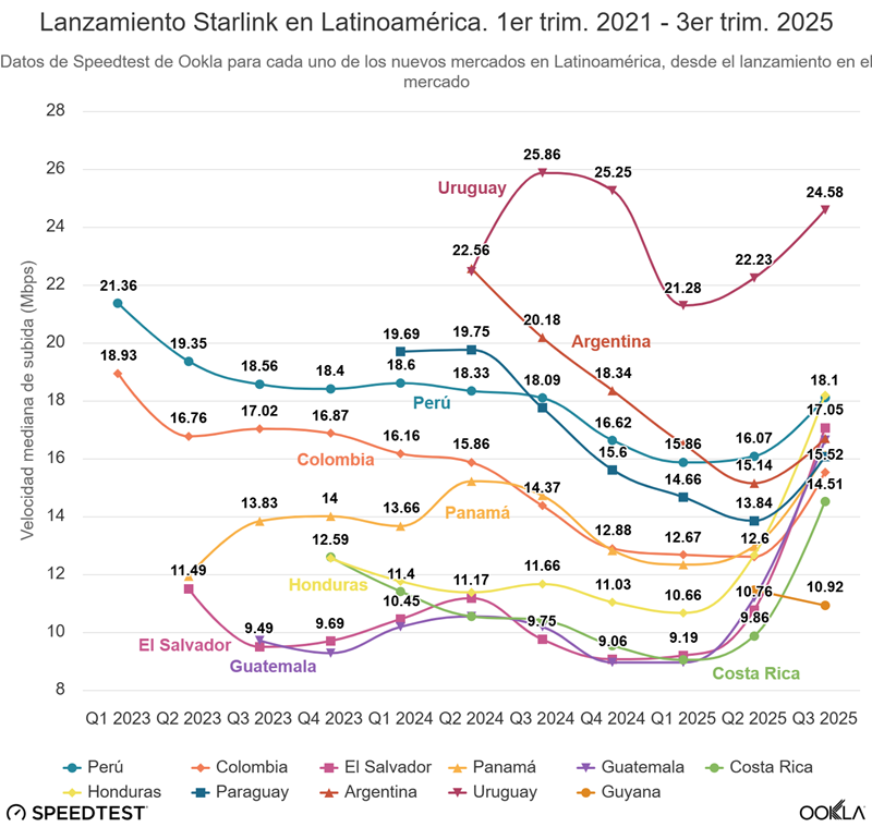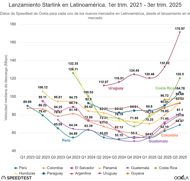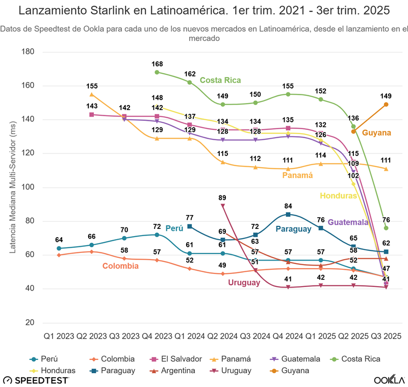 Las mediciones de latencia de Starlink —particularmente en países vecinos de Centroamérica como Costa Rica, Guatemala, El Salvador y Honduras— mostraron una mejora en el tercer trimestre de 2025. Esto puede deberse a la instalación de nuevas estaciones terrestres y otras infraestructuras terrestres en esa región específica. Dicho equipo puede encaminar más rápidamente el tráfico de los usuarios desde la red satelital de Starlink hacia la red troncal de internet pública a través de rutas físicamente más cortas y directas hacia los destinos de internet de los usuarios.