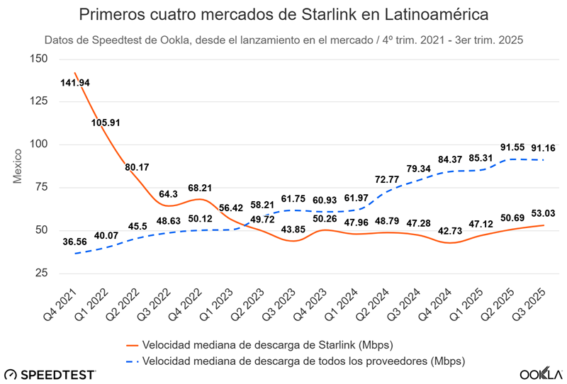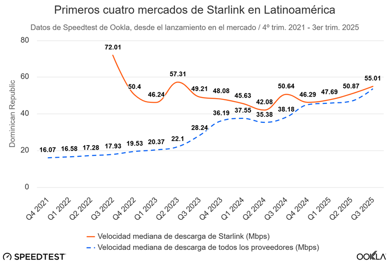 Mientras tanto, en la República Dominicana, las velocidades medianas de descarga de Starlink de 55,01 Mbps en el tercer trimestre de 2025 estuvieron muy cerca de las velocidades medias de descarga de 53,71 Mbps proporcionadas por los proveedores de internet fijos del país.