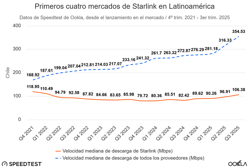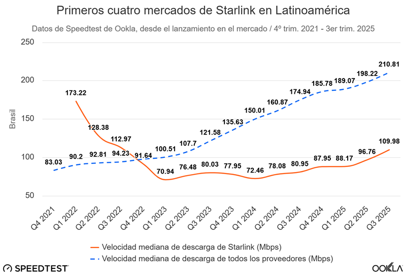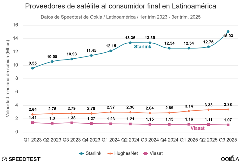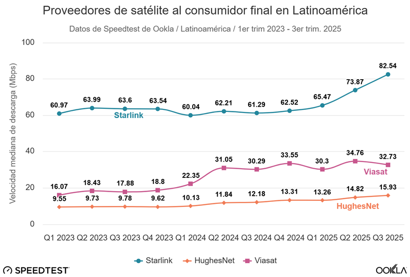 En cualquier caso, los usuarios rurales de internet en toda América Latina se beneficiarán: la velocidad media de descarga disponible a través de una conexión a internet por satélite —en todos los proveedores de internet por satélite— aumentó de 29,12 Mbps en el primer trimestre de 2023 a 72,01 Mbps en el tercer trimestre de 2025.