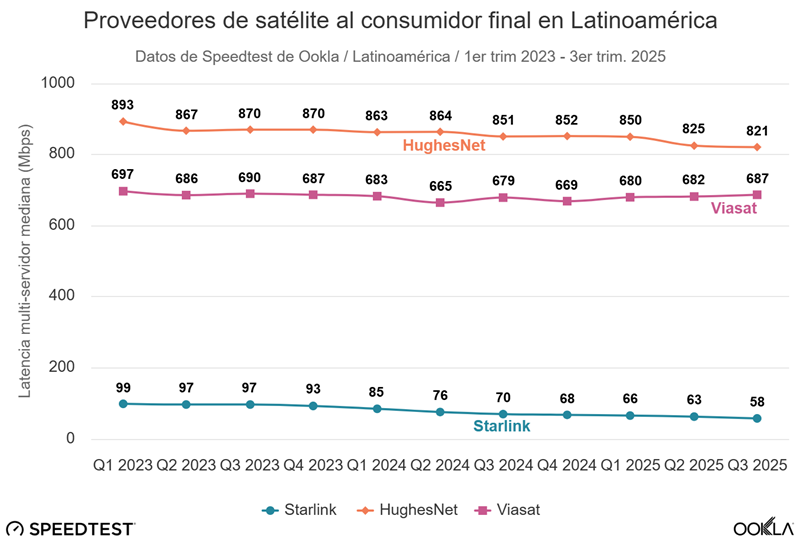 El servicio de internet Starlink de SpaceX es el líder claro entre los proveedores de internet por satélite orientados al consumidor en América Latina. De hecho, la compañía representó el 98,2% de todos las muestras de Speedtest por satélite hechas por consumidor registradas en toda la región en el tercer trimestre de 2025.