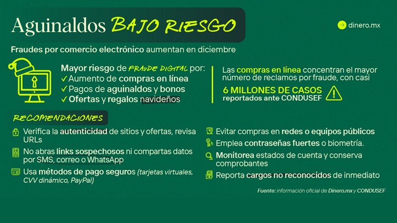 México 22 de diciembre de 2025.- Diciembre se ha consolidado como el mes más activo para los fraudes digitales relacionados con compras en línea. Alejandro Sena, director de Dinero.mx, señala que “la combinación de la entrega de aguinaldos, bonos de fin de año, ofertas, regalos navideños, vacaciones y altas ventas en comercio electrónico, crean el escenario ideal para que los estafadores cibernéticos puedan cometer los fraudes con mayor frecuencia durante este mes.”