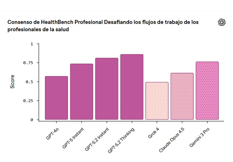 Puntos de referencia como HealthBench, una evaluación abierta diseñada por profesionales clínicos, también refuerzan este progreso. HealthBench mide el comportamiento de los modelos en escenarios médicos realistas mediante rúbricas elaboradas por médicos. Va más allá de la memoria de datos para evaluar el razonamiento clínico, la seguridad, la gestión de la incertidumbre y la calidad de la comunicación, dimensiones que reflejan mejor cómo los profesionales clínicos utilizan la IA en la práctica. En estas evaluaciones, los modelos GPT-5.2 superan sistemáticamente a las generaciones anteriores y a los modelos de comparación en flujos de trabajo clínicos reales.
