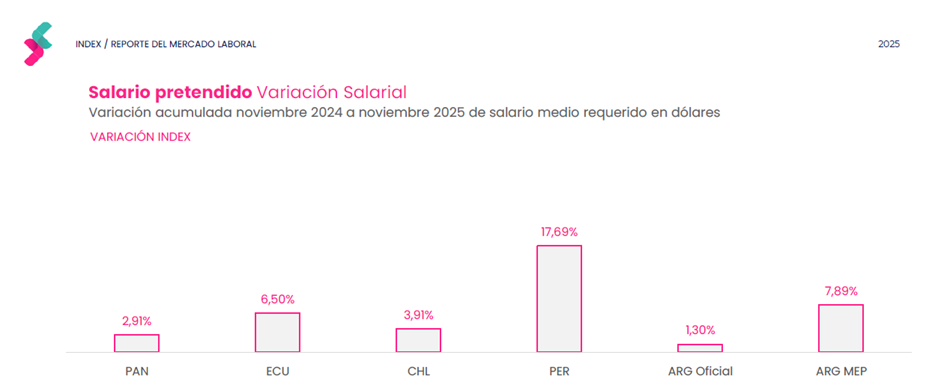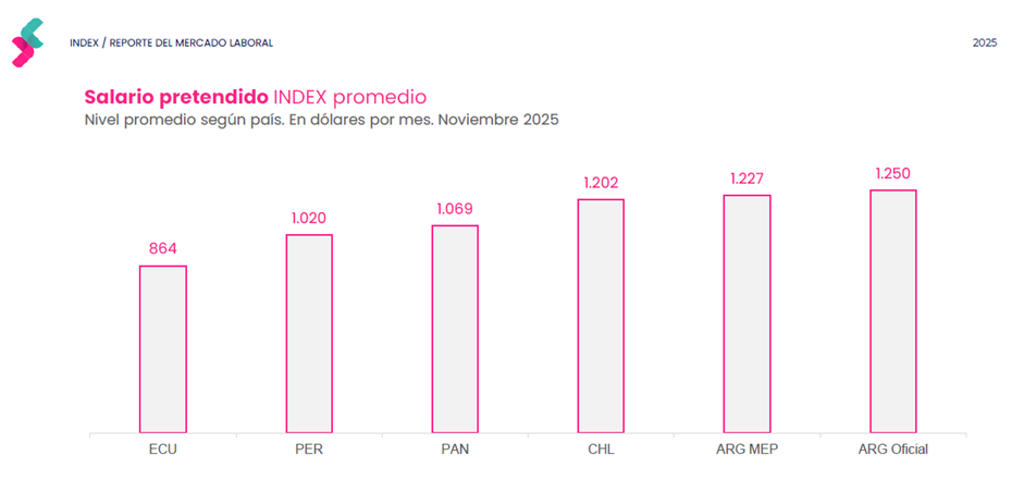 Según el informe, Panamá presentaun salario promedio pretendido de $1,069 por mes, ubicándose en el tramo medio de los países evaluados. Argentina mantiene el liderazgo con $1,250 en dólares oficiales por mes y $1,227 medido en dólares MEP, le sigue Chile, con un salario promedio pretendido de $1,202 por mes. Los países con los salarios pretendidos más bajos son Perú con $1,020 por mes y Ecuador con $864 por mes.
