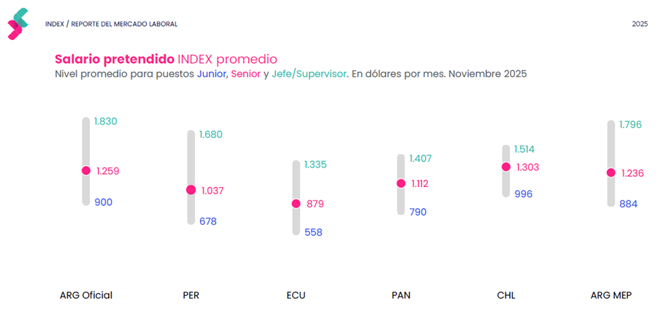 En posiciones Junior, Chile registra el salario promedio pretendido más alto con US$1,059 por mes, le sigue Argentina con $864 (dólar oficial) y $849 (dólar MEP) por mes; Panamá con $845, Perú con $810 y Ecuador con la aspiración más baja de $598 por mes.