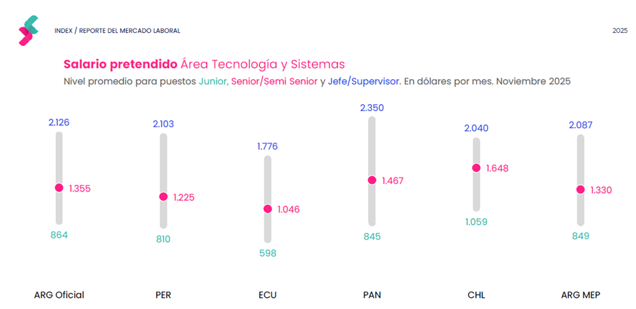 En el sector Tecnología y Sistemas, Panamá muestra el mayor salario promedio requerido de la región en mandos altos de Jefe/Supervisor con $2,350; le sigue en este segmento, Argentina con $2,126 (dólar oficial por mes), Perú con $2,103, Argentina con $2,087 (dólar MEP), Chile con $2,040 y Ecuador con $1,776.