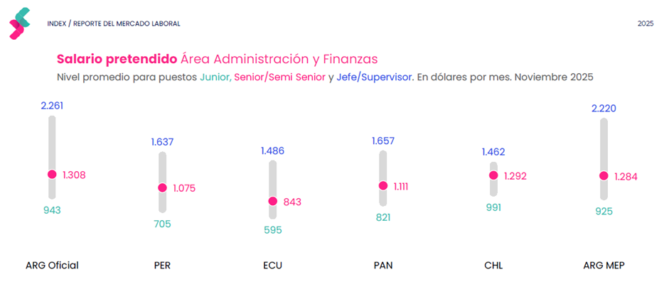 En Administración y Finanzas, el mayor salario promedio pretendido para puestos Junior lo mantiene Chile con US$ 991; le sigue Argentina con $943 (dólar oficial) y $925 (dólar MEP); Panamá con $821; Perú con $705 y en el tramo final se encuentra Ecuador con $595.