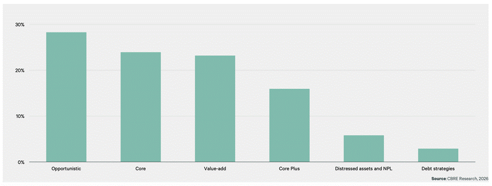 Las preferencias de los inversionistas en América Latina reflejan un enfoque diversificado a través del espectro de riesgo, combinando un posicionamiento defensivo con un apetito selectivo por estrategias de mayor riesgo. Las estrategias Core y Core Plus (Activos inmobiliarios de alta calidad y estabilidad) continúan atrayendo un interés significativo, subrayando una preferencia por la estabilidad de ingresos y una menor volatilidad en medio de un entorno macroeconómico y financiero incierto.