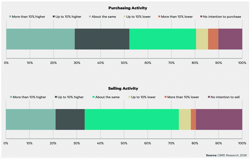 Las intenciones de compra y venta en América Latina sugieren un entorno de transacciones mayormente estable, con inversionistas que esperan mantener o aumentar selectivamente los niveles de actividad. A nivel regional, esta perspectiva refleja condiciones macroeconómicas más predecibles y un reenganche cauteloso con el mercado, apoyando una participación disciplinada en lugar de cambios abruptos en el posicionamiento.