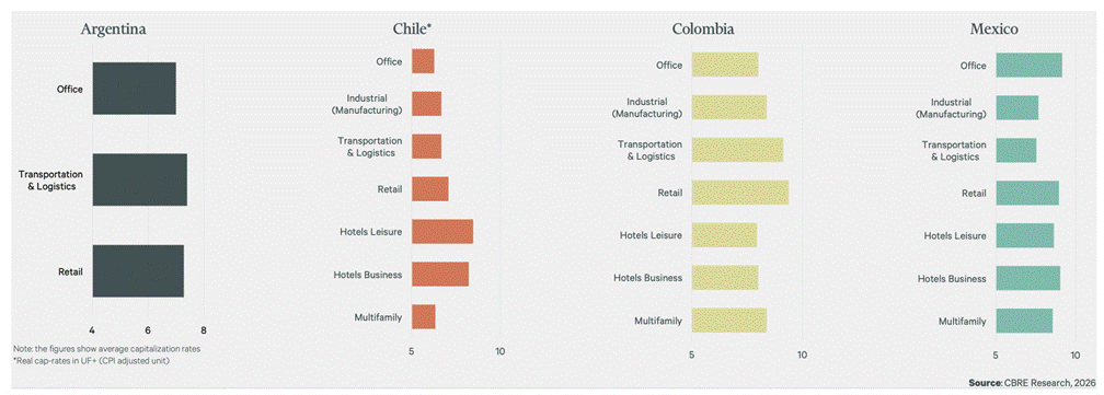 El interés de los inversionistas permanece concentrado en mercados metropolitanos establecidos y submercados clave por país, lo que refuerza la importancia de la escala, la liquidez y el historial de desempeño. Las tasas de capitalización (cap rates) en toda la región sugieren un entorno de precios estable, con una diferenciación impulsada principalmente por el país y las características del activo, más que por una volatilidad de mercado generalizada.