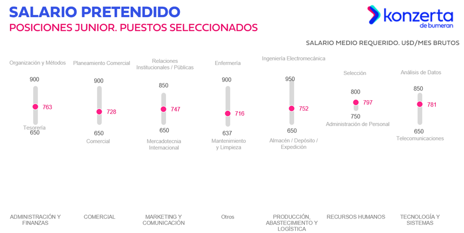 Ingeniería Electromecánica de la categoría de Producción, Abastecimiento y Logísticacon USD $950; Enfermería deOtros conUSD $900; Planeamiento Comercial de Comercialcon USD $900; Organización y Métodos de Administración y Finanzascon USD $900; Relaciones Institucionales y Públicas de Marketing y Comunicación con  USD $850; Análisis de Datos de Tecnología y Sistemas con USD $850;  Finalmente, con una aspiración de $800 lo ocupa el puesto de Selección en el área de Recursos Humanos CON USD $800.