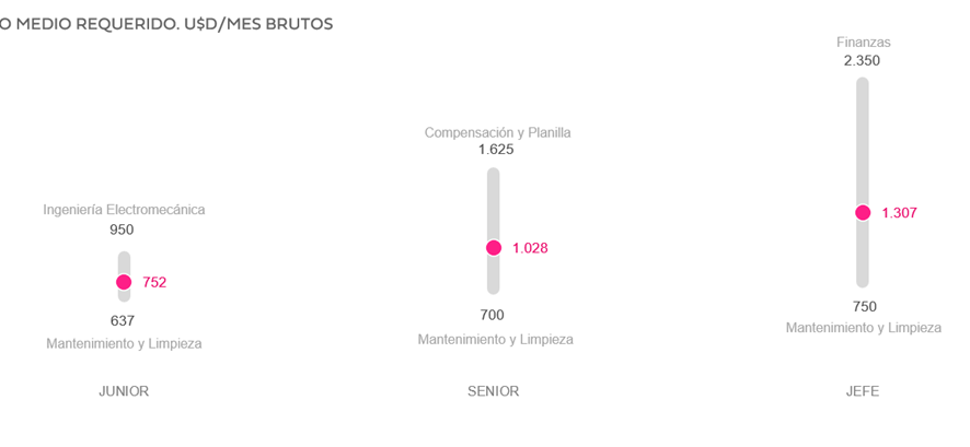 En contraste, los puestos con salarios pretendidos más bajos son Mantenimiento y Limpieza para el segmento Junior, Semi Senior y Senior, y Jefe o Supervisor, con USD $637, USD $700 y USD $750, respectivamente.