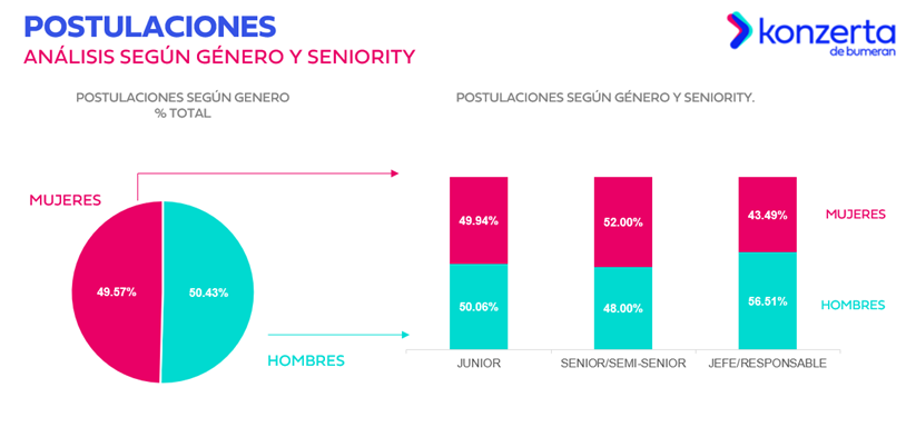 En cuanto al porcentaje de las postulaciones por género y seniority, se observa que, en el segmento Junior, el 50.06% de las postulaciones corresponden a varones, mientras que el 49.94% a mujeres. En la categoría Semi-Senior y Senior el 52% pertenecen a mujeres, y el 48% a hombres; y en el segmento de Jefe o Supervisor el 56,51% corresponden a varones y el 43,49% a mujeres.